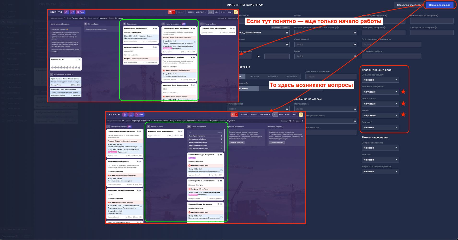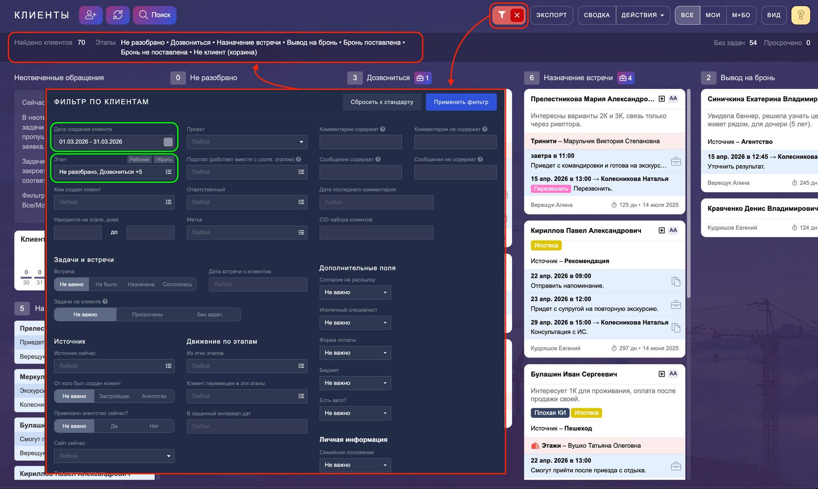 Решение: в фильтрах выбираем срок и помним, что надо отметить ВСЕ этапы (включая и закрывающие), нажимаем на кнопку "Применить фильтр" и видим на канбане всех отобранных клиентов.