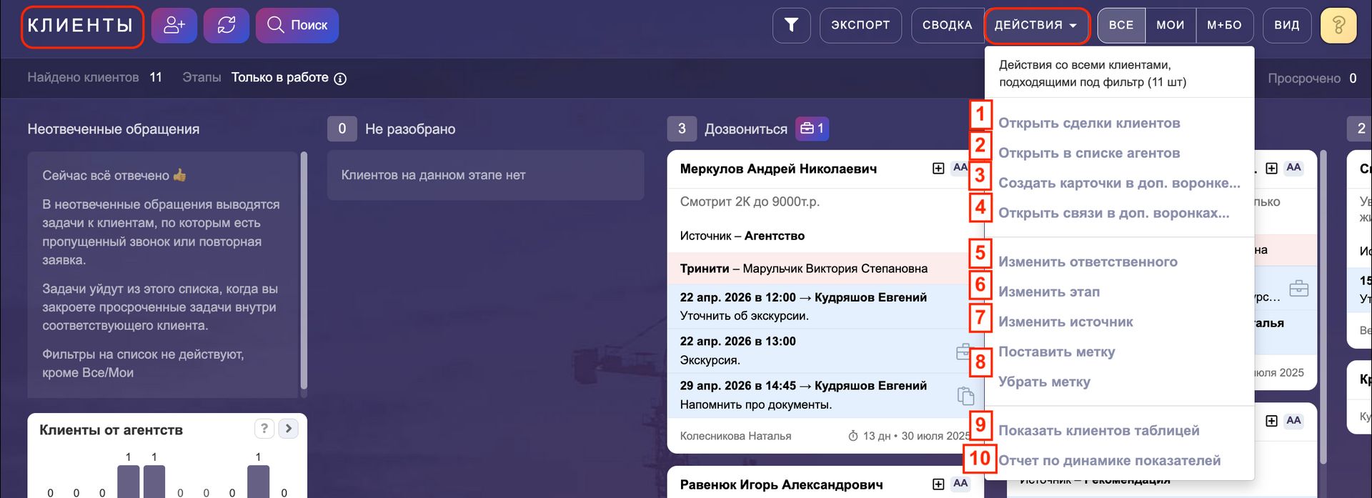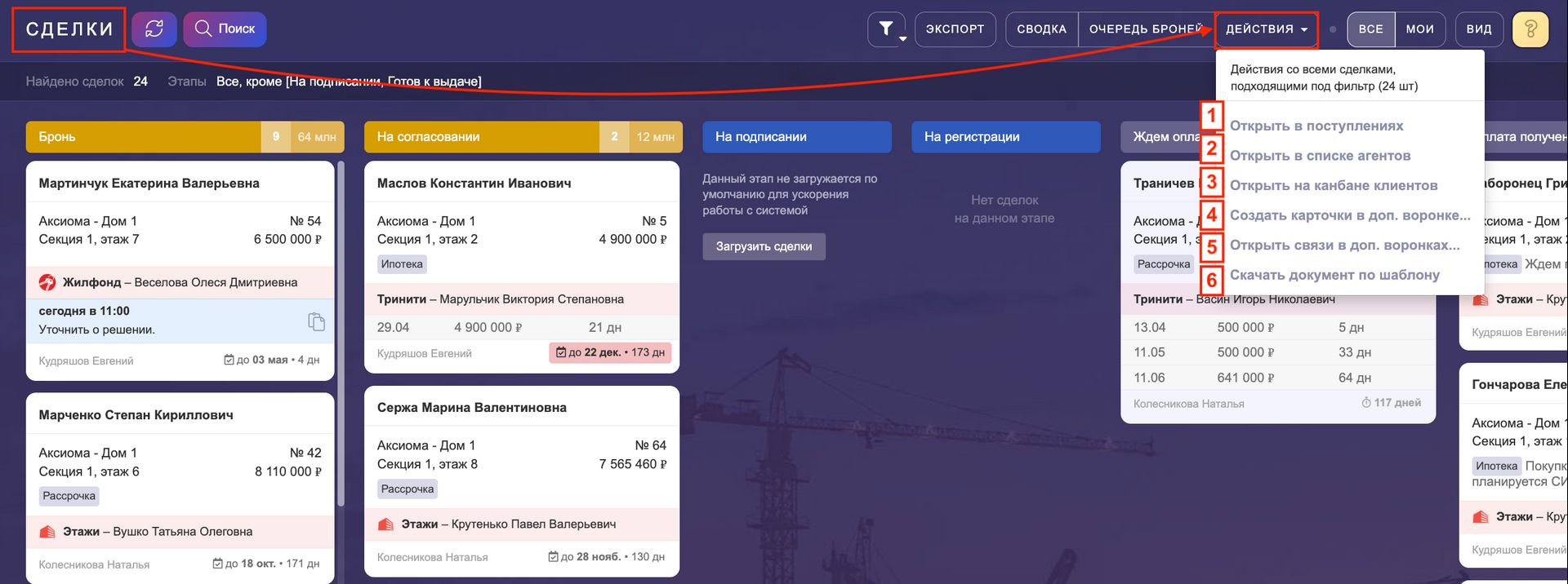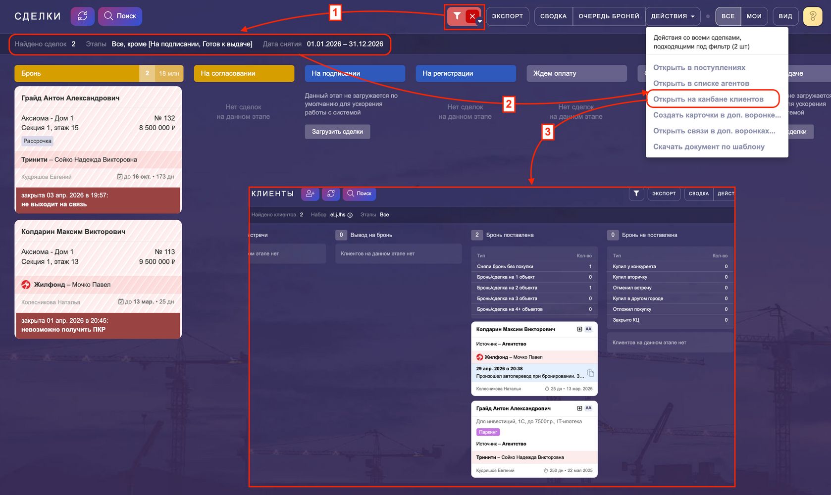 3. Открыть на канбане клиентов —покажет карточки клиентов, привязанных к выбранным сделкам. Они откроются на этапе "Бронь поставлена".