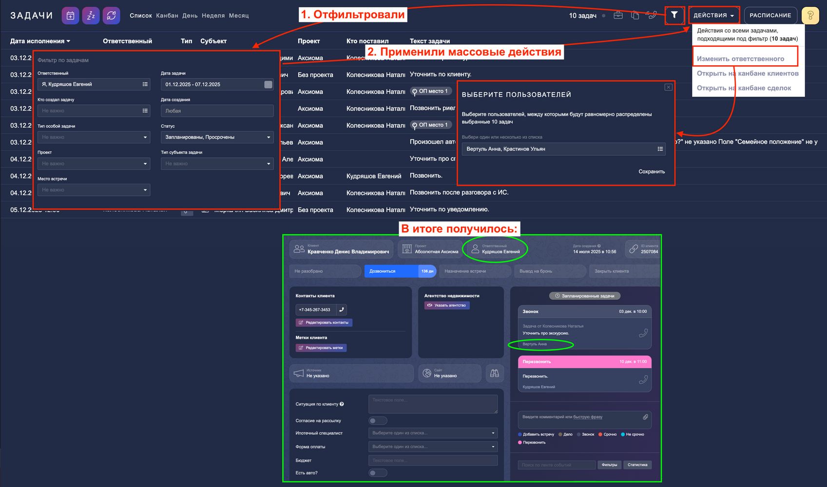 Перед использованием данного функционала обязательно примените фильтр. Это поможет предотвратить случайное выполнение действий с неправильными клиентами/сделками и избежать нежелательных последствий.