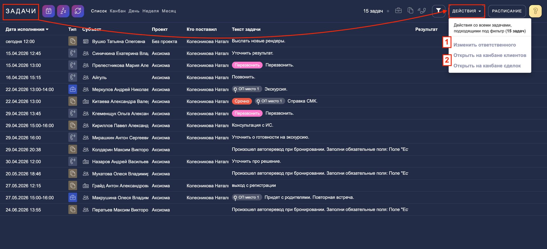 2. Открыть на канбане клиентов/сделок — система откроет в соседней странице карточки клиентов/сделок на соотвествующих канбанах согласно отобранным задачам.