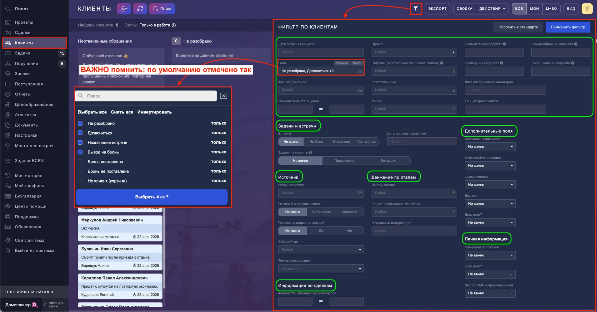 Обращаем ваше внимание, что при фильтрации клиентов по умолчанию включены только рабочие этапы. Если вы желаете, чтобы в отборе участвовали закрывающие этапы, включите их — про это часто забывают))