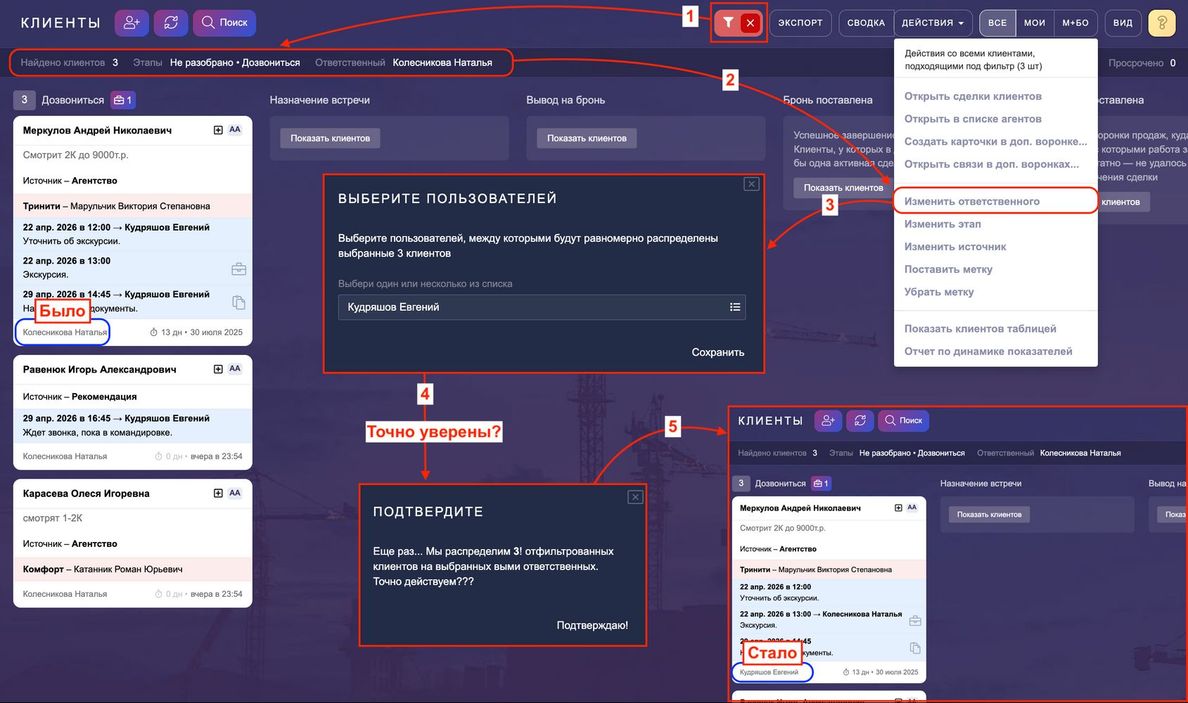 5. Изменить ответственного — заменяет ответственного сотрудника у отфильтрованных клиентов на другого/других.