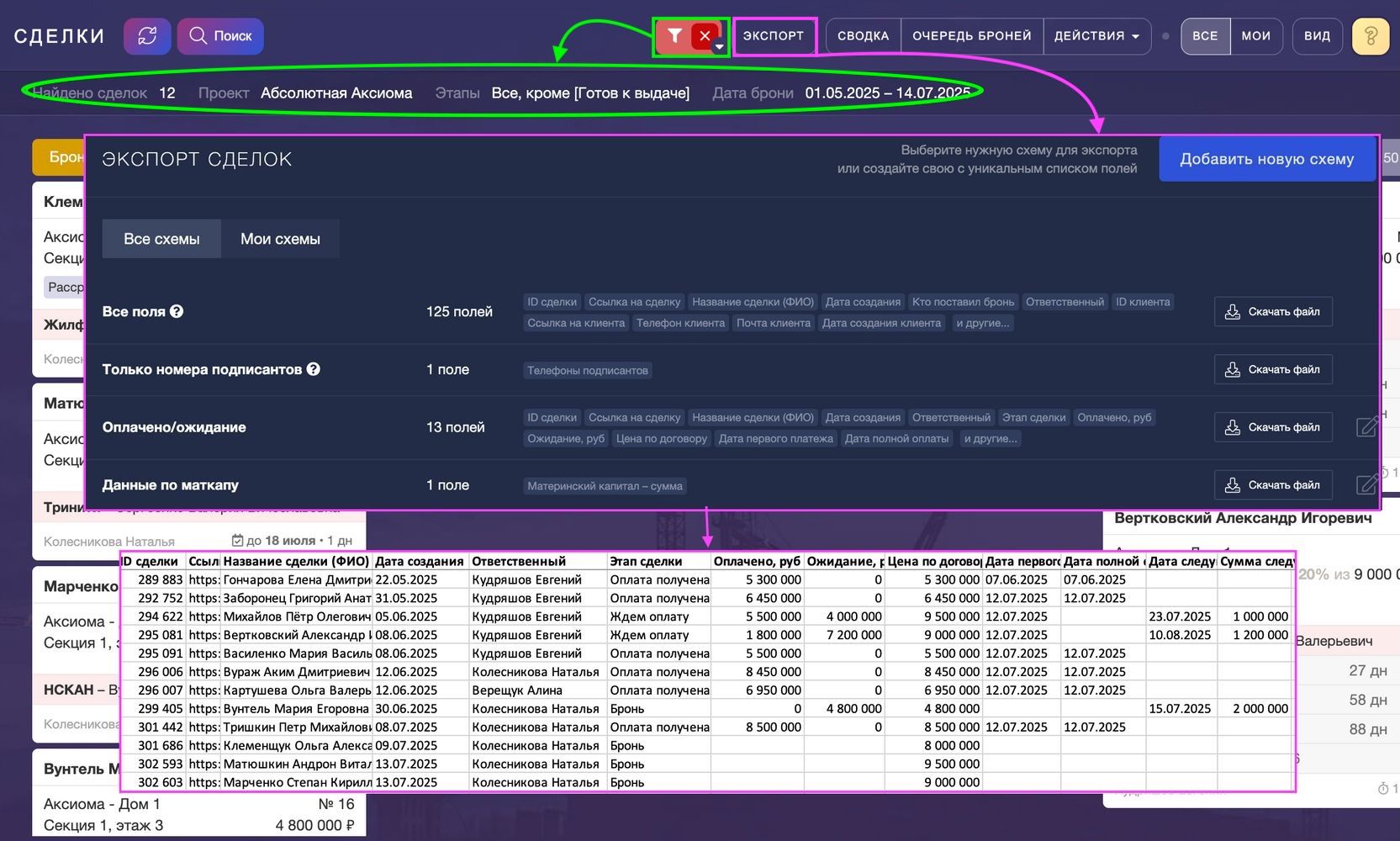 Например, есть задача выгрузить все платежи по сделкам в период с мая-июль 2025г. Что делаем? В фильтрах указываем в дате брони период с мая-июль, переходим в Экспорт, там уже есть ранее созданная схема Оплачено/ожидание, нажимаем скачать, готово!