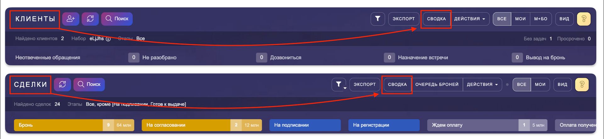 Кнопка "Сводка" есть как на канбане КЛИЕНТЫ, так и на канбане СДЕЛКИ: