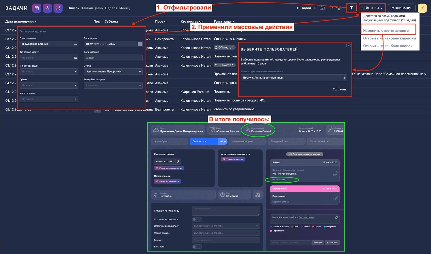 Перед использованием данного функционала обязательно примените фильтры. Это поможет предотвратить случайное выполнение действий с неправильными клиентами/сделками и избежать нежелательных последствий.