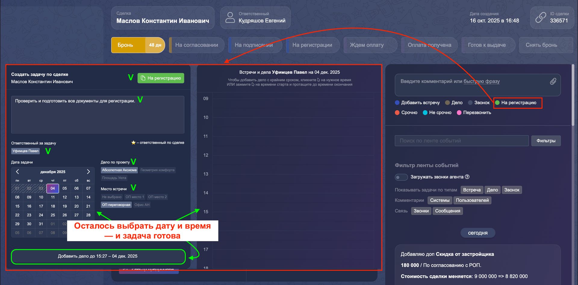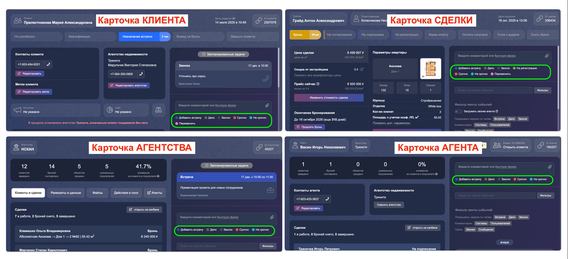 Назначить задачи можно из карточки клиента, из карточки сделки, из карточки риелтора, из карточки АН: