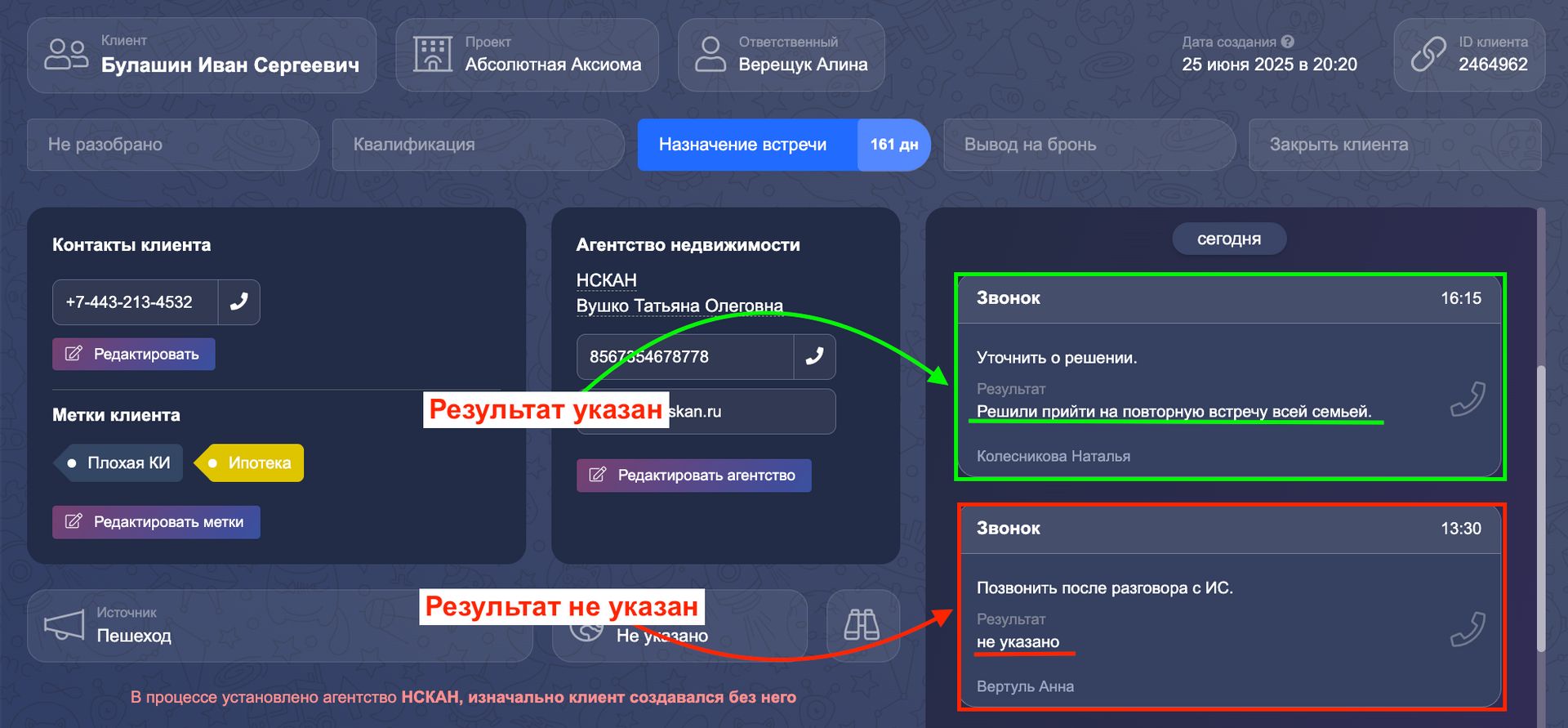 В-третьих, это история работы с клиентом — тоже про эффективность и своевременность реакции, не надо спрашивать что с клиентом, как проходила работа, достаточно открыть карточку клиента/сделки и все видно.