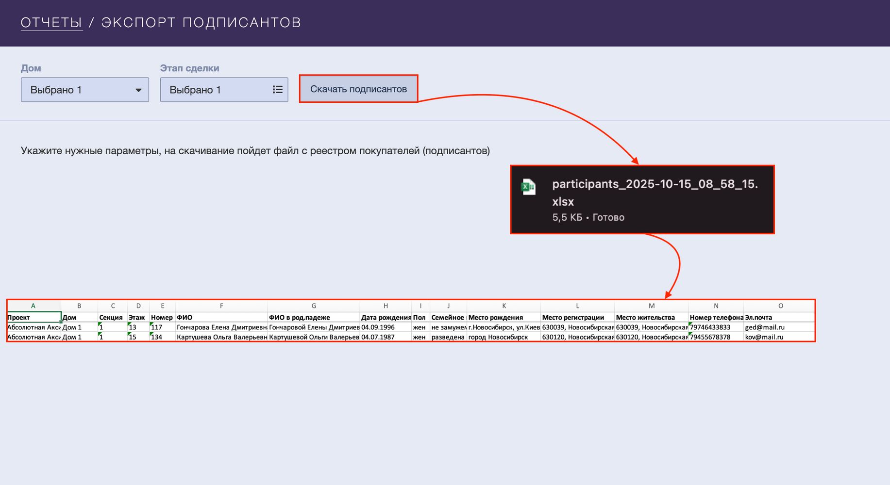 После того как вы настроили оба фильтра, нажмите кнопку "Скачать подписантов". Система сформирует файл по следующим критериям: