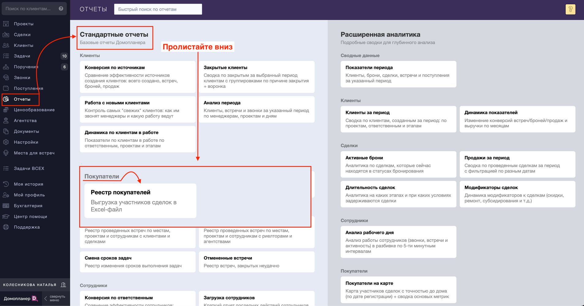 В Домопланере есть отдельный вид отчета, предназначенный выгружать данные о клиентах, которые находятся на этапе сделок — экспорт подписантов.