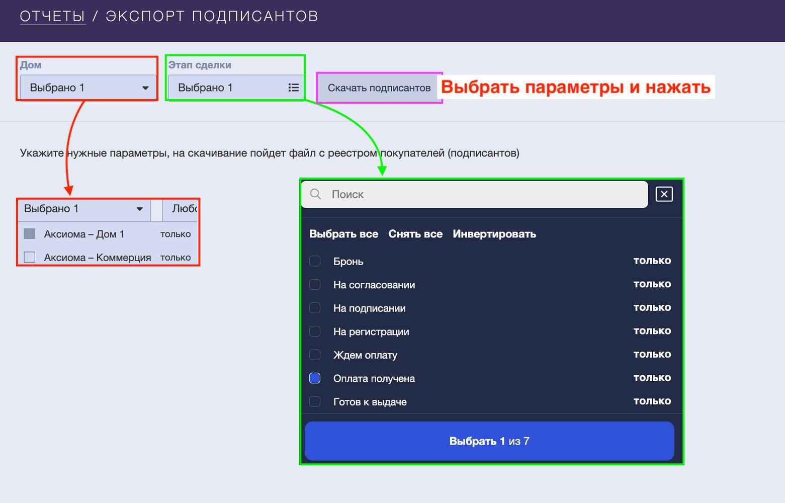 В открывшемся окне вам необходимо выбрать в выпадающих списках — дом и этап сделки для выгрузки.