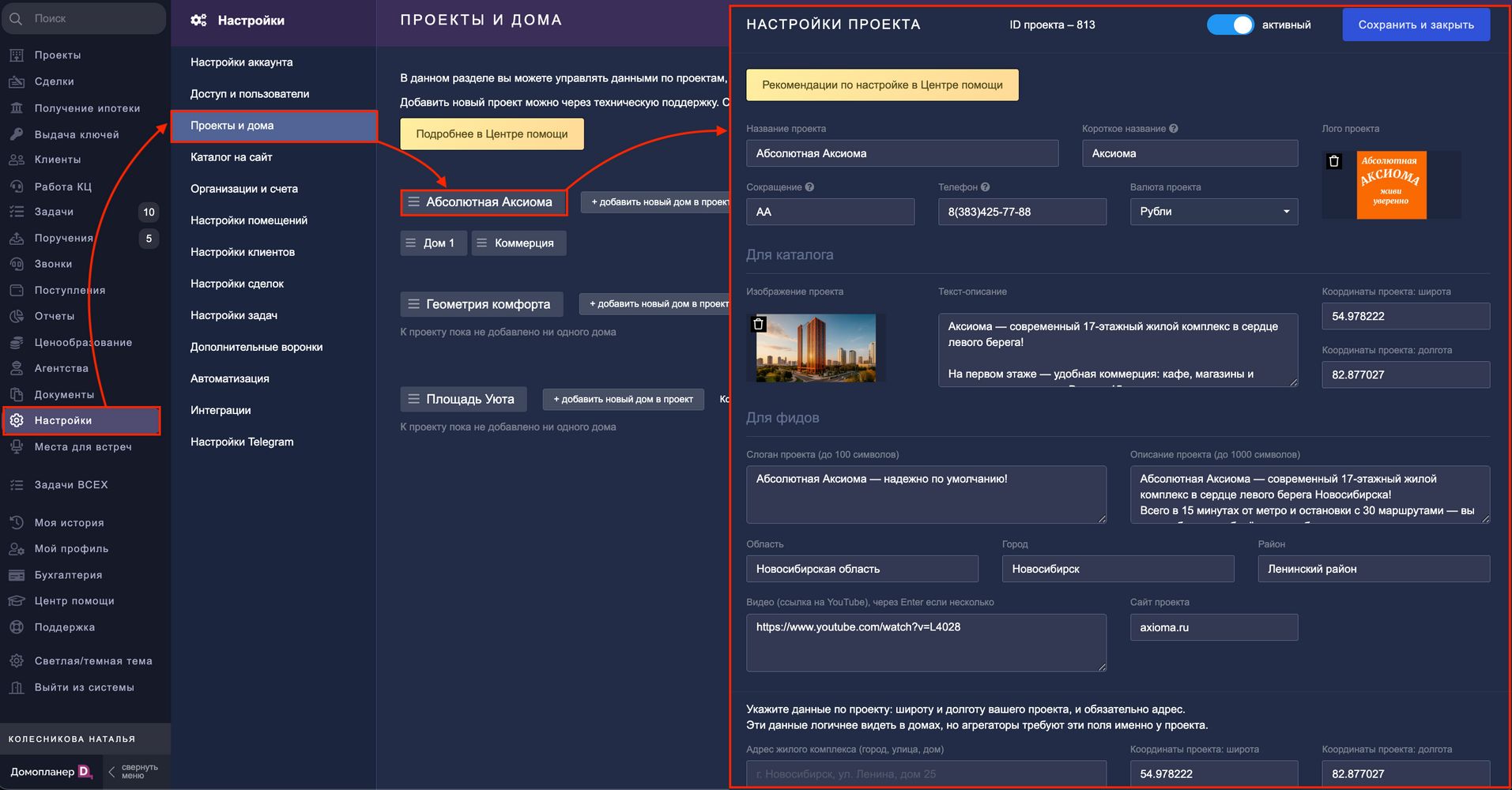 Для этого пройдите в НАСТРОЙКИ — Проекты и дома — кликните на нужный проект — откроется окно "Настройки проекта" — заполните все графы и нажмите кнопку “Сохранить и закрыть”: