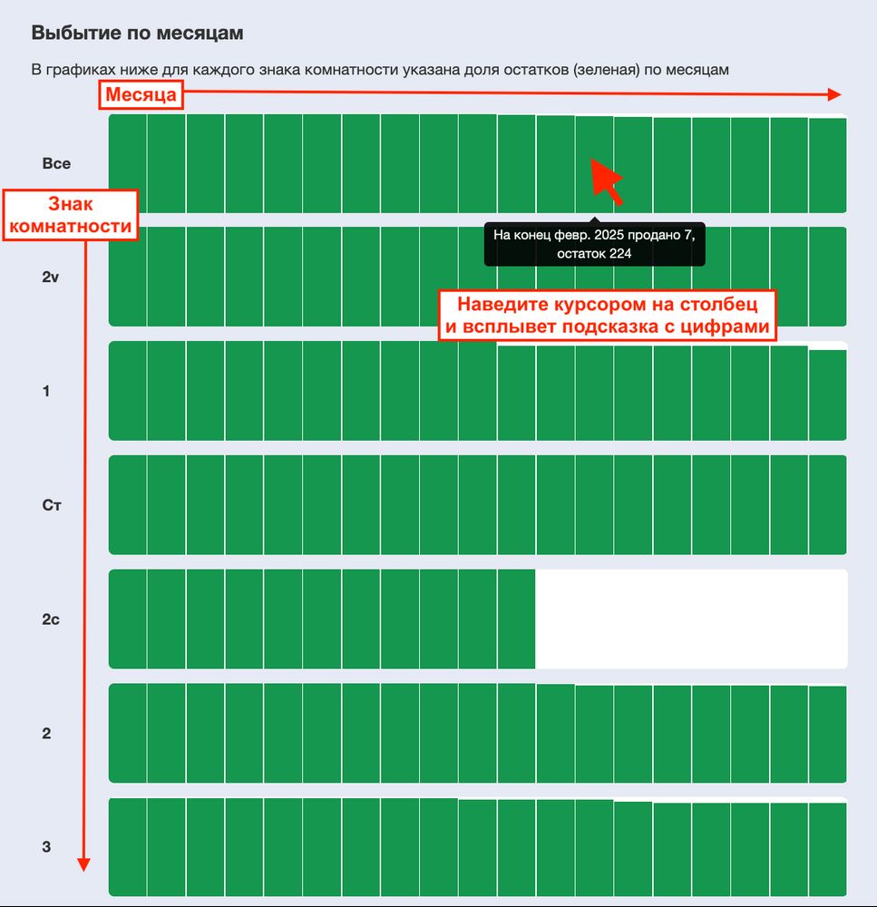 Он показывает цифры продаж за месяц и количество квартир, которые остались непроданными к концу каждого месяца — просто наведите курсором на столбец.