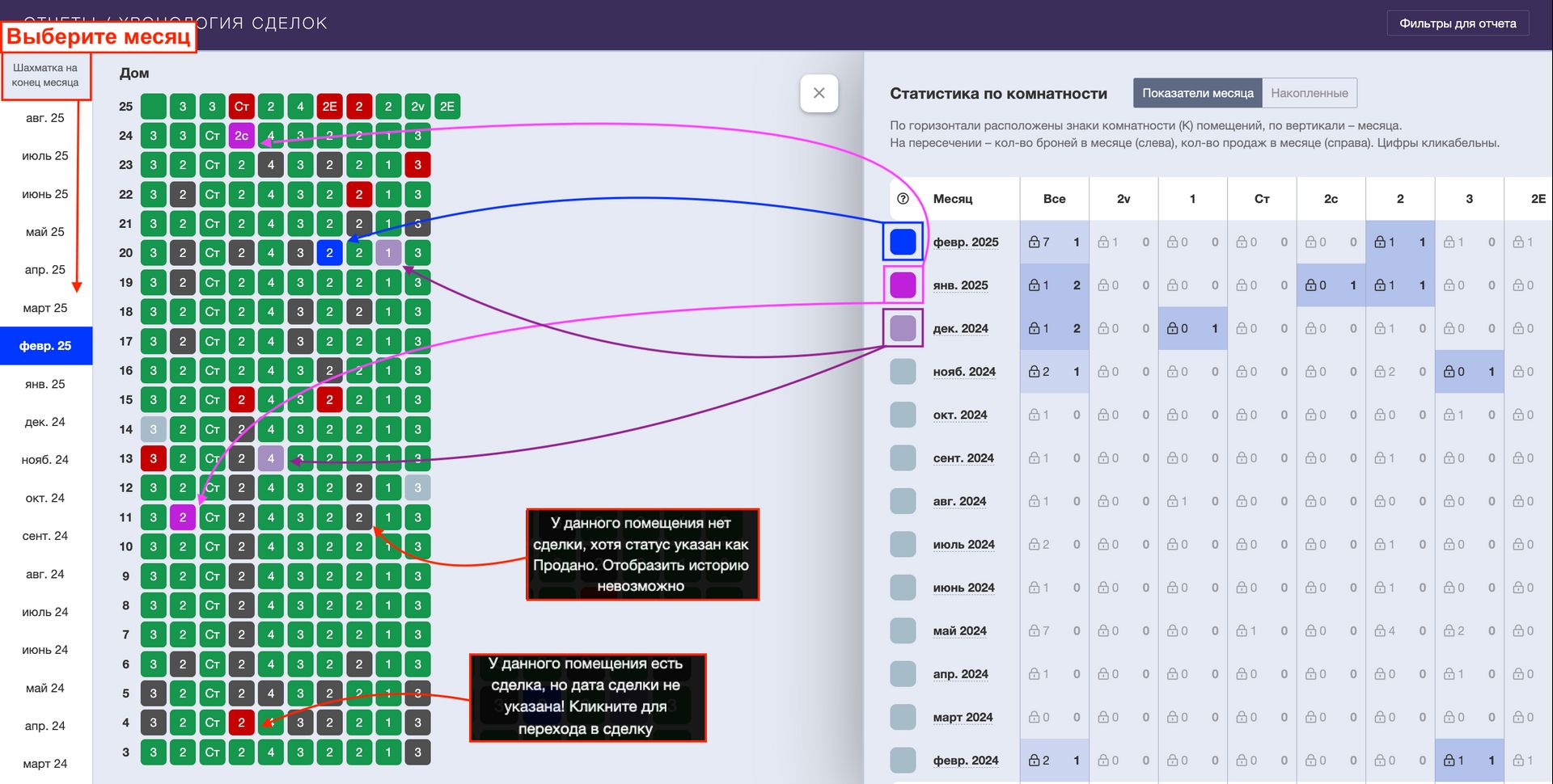 Временная шкала слева — это ваш главный инструмент для навигации по истории продаж. Выберите интересующий месяц и система автоматически раскрасит ячейки на шахматке.