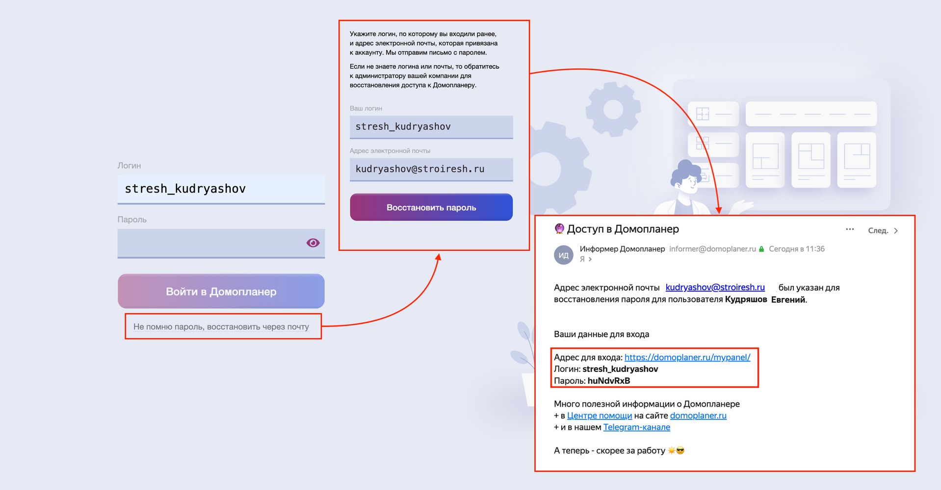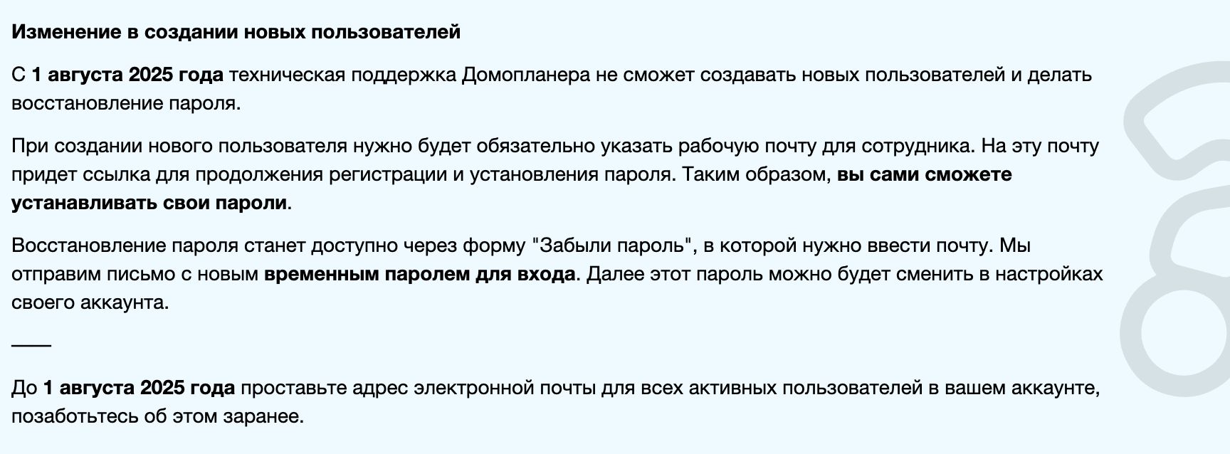 2. Поддержка Домопланера больше не создает новых пользователей и не восстанавливает пароли. (Кстати, если забыли как создать пользователя, то здесь об этом подробно написано).