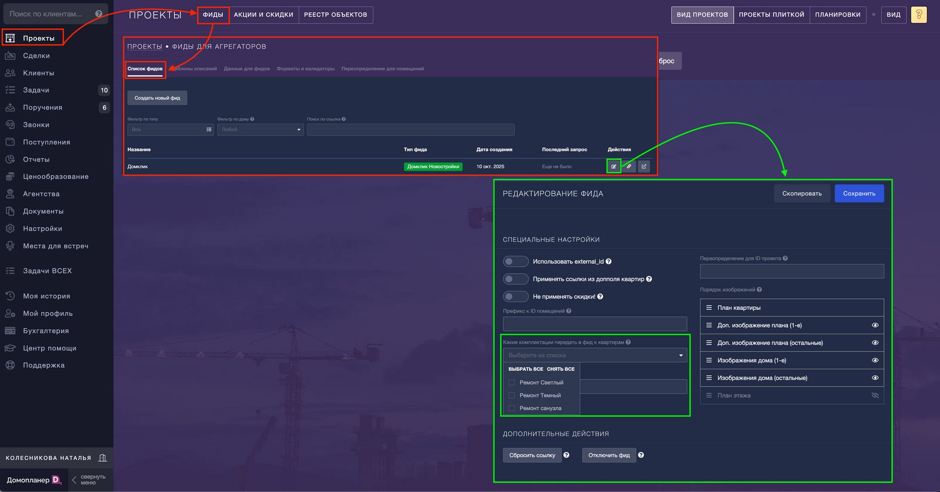 При создании или редактировании фида (напомним, что это сделать вы можете в разделе ПРОЕКТЫ — Фиды — Список фидов), в блоке "Специальные настройки" появилась опция "Какие комплектации передать в фид к квартирам". Она позволяет выбрать только те комплектации, которые нужно передавать в фид: