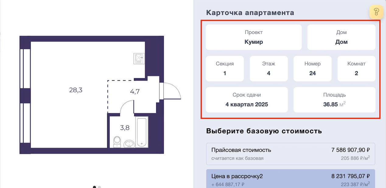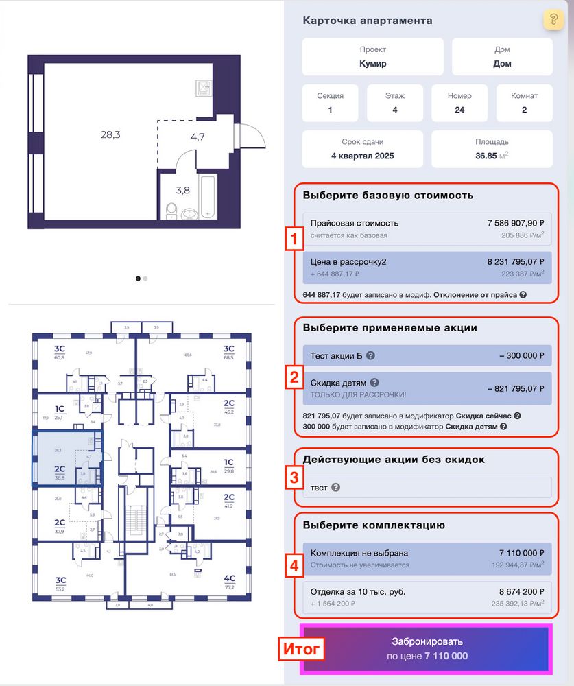 3. Проверьте акции — система сразу покажет спецпредложения, доступные для этой квартиры и не влияющие на её стоимость.