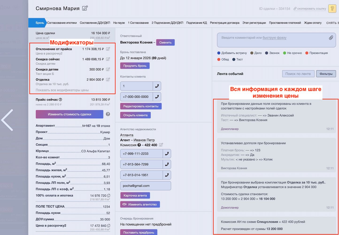 А чтобы вы были спокойны за каждое решение, система сохранит всю историю расчетов в карточке сделки — в модификаторах и Ленте событий: