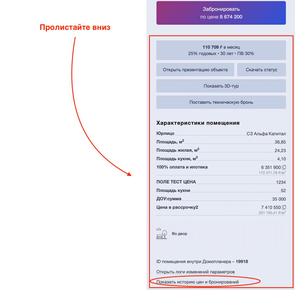 Просто пролистайте вниз — и найдете знакомые кнопки презентации, статуса, ипотечного расчета, все дополнительные поля, особенности и т.д.