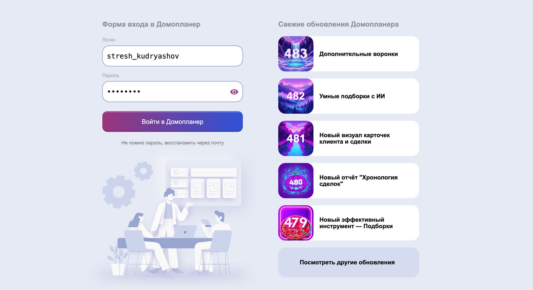 Мы хотим, чтобы вы тратили меньше времени на поиск информации о новых возможностях, и больше — на работу с клиентами. Поэтому прямо на странице входа мы запустили ленту "Свежие обновления Домопланера".