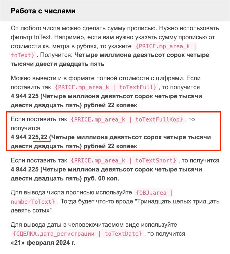 Добавлена новая переменная "toTextFullKop", которая отображает сумму и в текстовом, и в числовом варианте с обязательным указанием копеек. Это требование часто необходимо для корректного оформления юридических и финансовых документов.