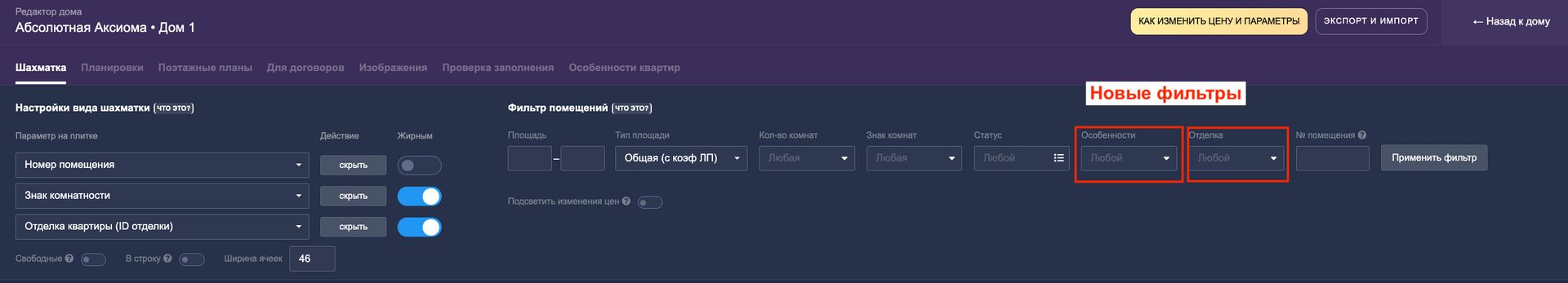 В Визуальном редакторе дома появились новые фильтры — Особенности и Отделка: