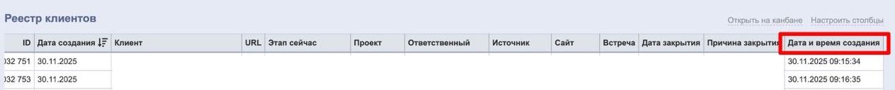 В отчётах по клиентам и сделкам добавлено новое поле "Дата и время создания". Оно отображает точную дату и временную метку создания записи.