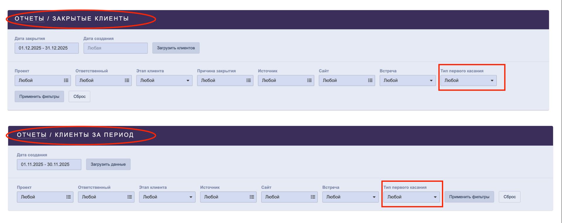 В отчетах "Клиенты за период" и "Закрытые клиенты" добавлена фильтрация по типу первого касания. Теперь вы можете анализировать, с каких каналов приходят клиенты (например, звонок, мессенджер, заявка с сайта) и как это влияет на их дальнейшее движение по воронке и итоговую конверсию:
