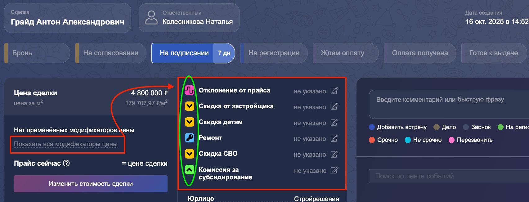 В карточке сделки появились иконки для каждого типа модификатора. Это упрощает визуальный поиск и ускоряет выбор нужных опций: