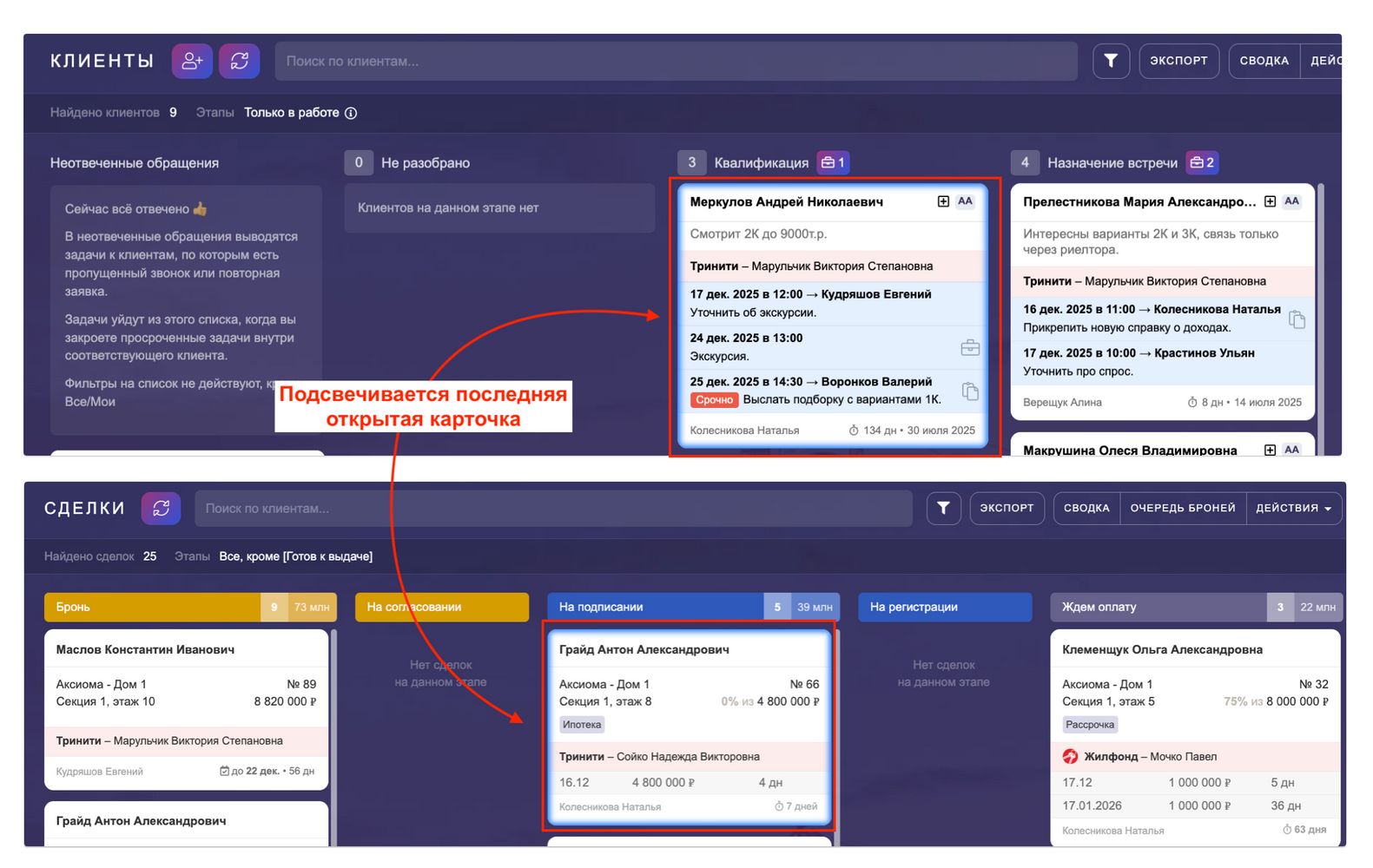 Теперь на канбанах клиентов и сделок автоматически подсвечивается последняя открытая вами карточка. Визуально это выделяется синей рамкой вокруг соответствующей карточки.