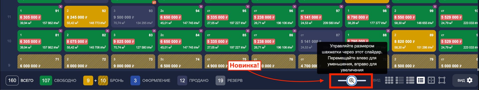 Во всех видах отображения шахматки (кроме вида "этажи" и "планировки") теперь доступен ползунок "Зум":