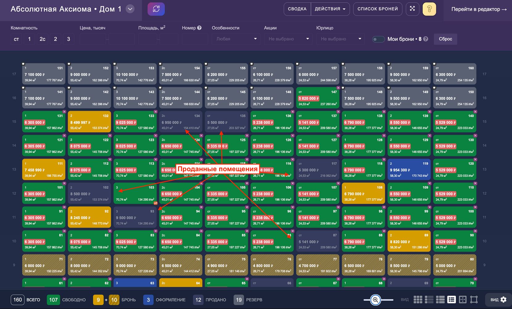 — Чёткая визуализация статусов: проданные квартиры теперь выделяются более ярко и контрастно, что позволяет мгновенно оценить заполненность дома.