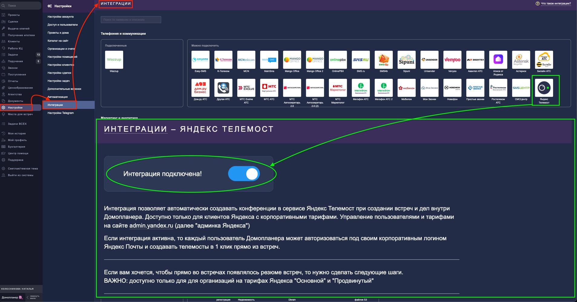 Обратите внимание! Если вы хотите, чтобы конспект встречи автоматически сохранялся в ленте событий задачи в Домопланере, то подробная инструкция по настройке этого процесса доступна здесь же, прямо в Домопланере — НАСТРОЙКИ — Интеграции — Яндекс Телемост.