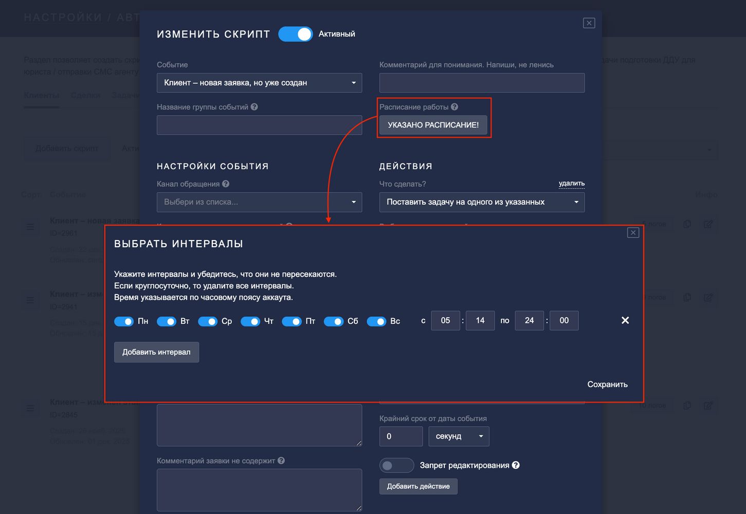 Мы добавили инструмент для точного контроля времени работы ваших скриптов автоматизации. Теперь в настройках каждого скрипта доступна графа "Расписание работы":