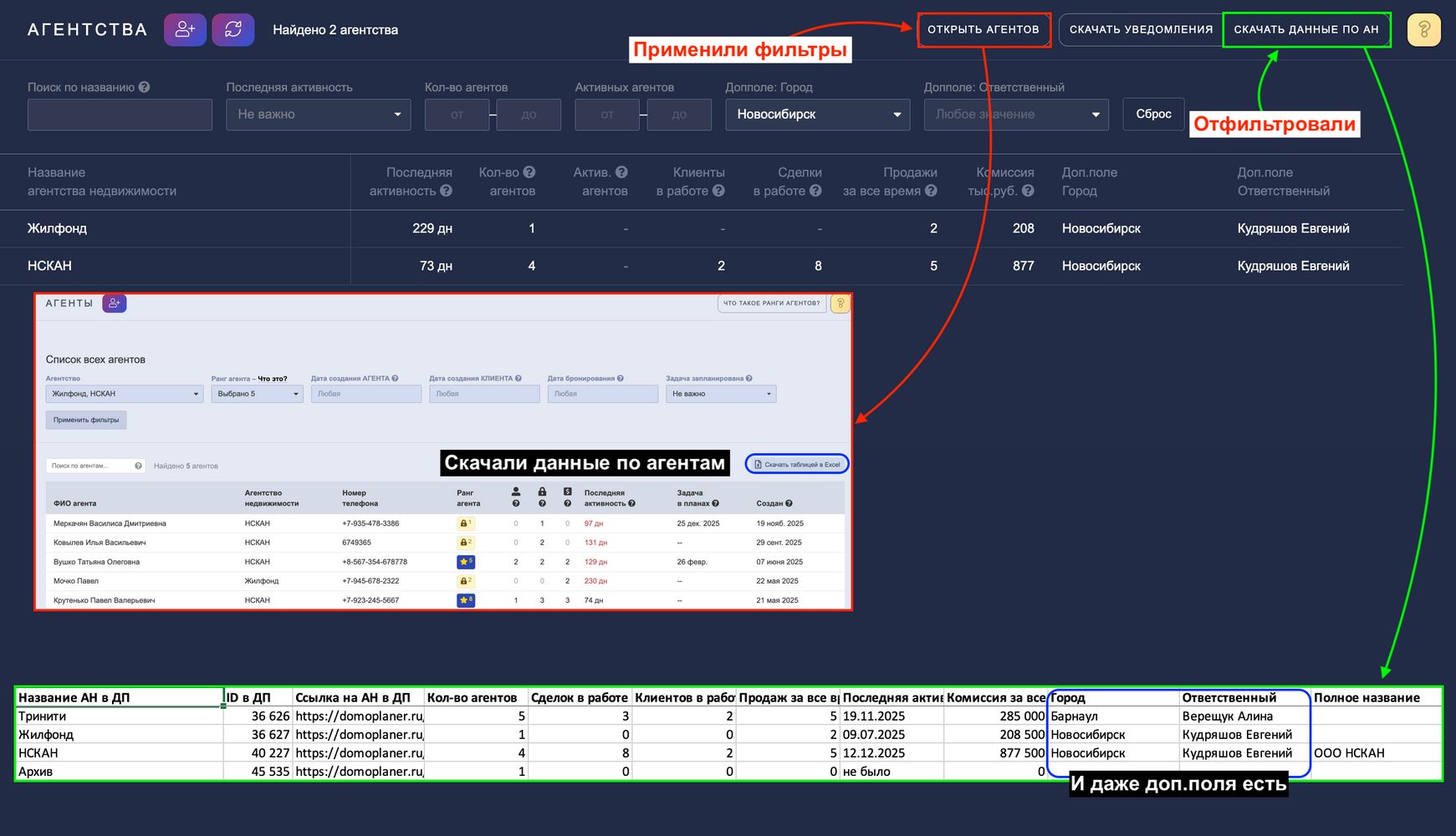 Функция позволяет одним нажатием перейти к списку всех агентов, входящих в отфильтрованные агентства. Это особенно полезно, когда нужно собрать контакты для массовой рассылки, например, по агентам из конкретного города.