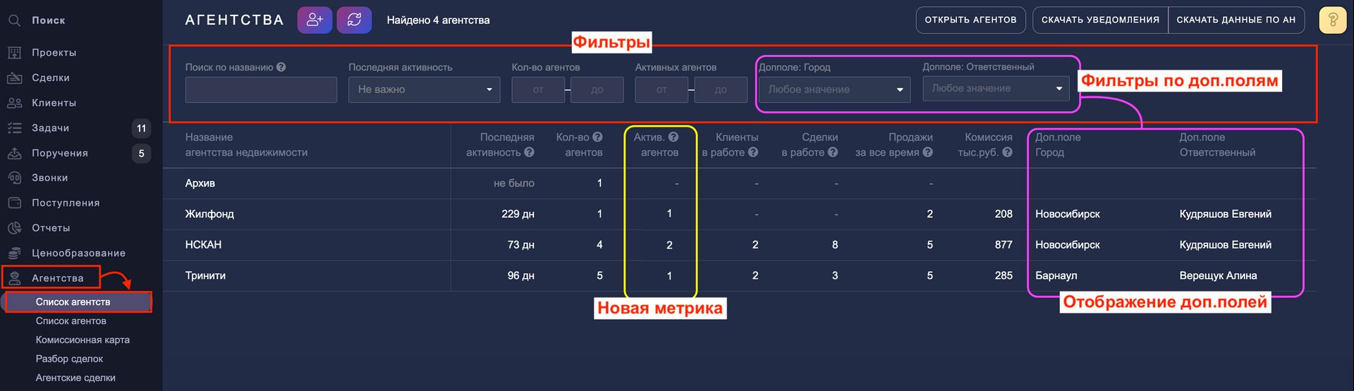 Теперь значения дополнительных полей агентств отображаются прямо в общей таблице. Это значит, что вам больше не нужно заходить в карточку каждого агентства, чтобы увидеть важную информацию — город, ответственного, тип сотрудничества и другие параметры. Все необходимое всегда перед глазами.