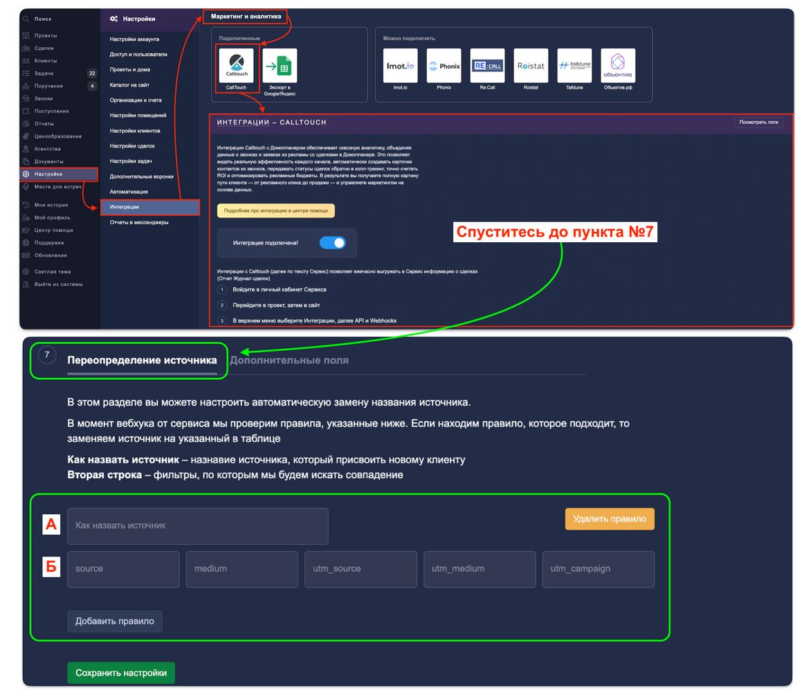 Перейдите в НАСТРОЙКИ — Интеграции — Маркетинг и аналитика — Интеграция с Calltouch: